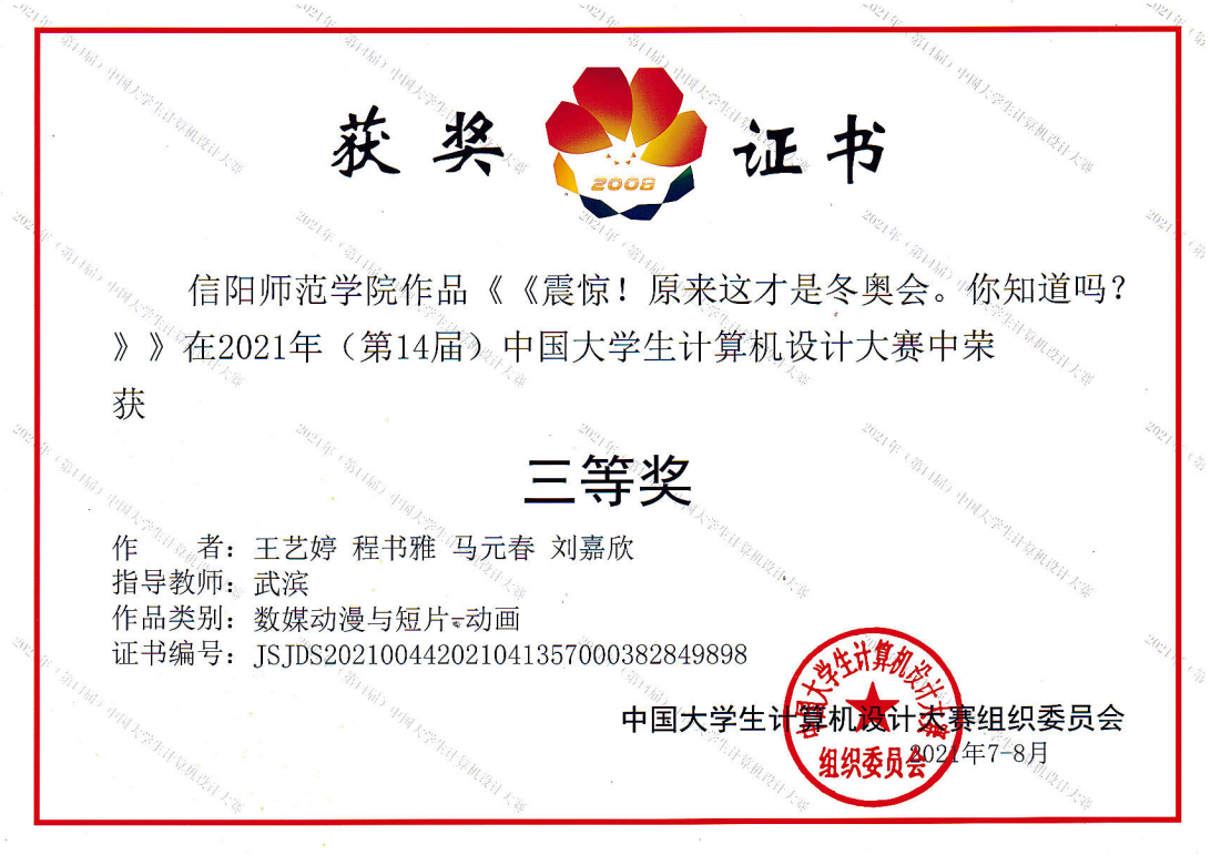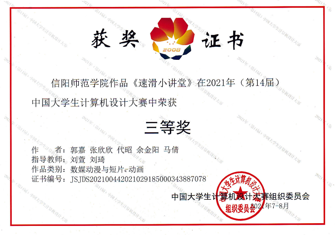 时间:2021-10-05 18:20:28 来源: 作者: 阅读: 次近日,由国家教育部主办的2021年第十四届中国老员工计算机设计大赛落下帷幕,在厦门决赛赛区数媒动漫与短片普通组比赛中,公司两组作品经过河南省大赛推选,与全国上百所高校参赛作品进行角逐,最终脱颖而出,均荣获国家级三等奖。获奖作品是由公司教育技术系老师武滨指导,王艺婷、马元春、刘嘉欣和程书雅完成的动画作品《震惊!原来这才是冬奥会。你知道吗?》,刘萱、刘琦老师指导,郭嘉、张欣欣、代昭、余金阳和马倩完成的动画作品《速滑小讲堂》。