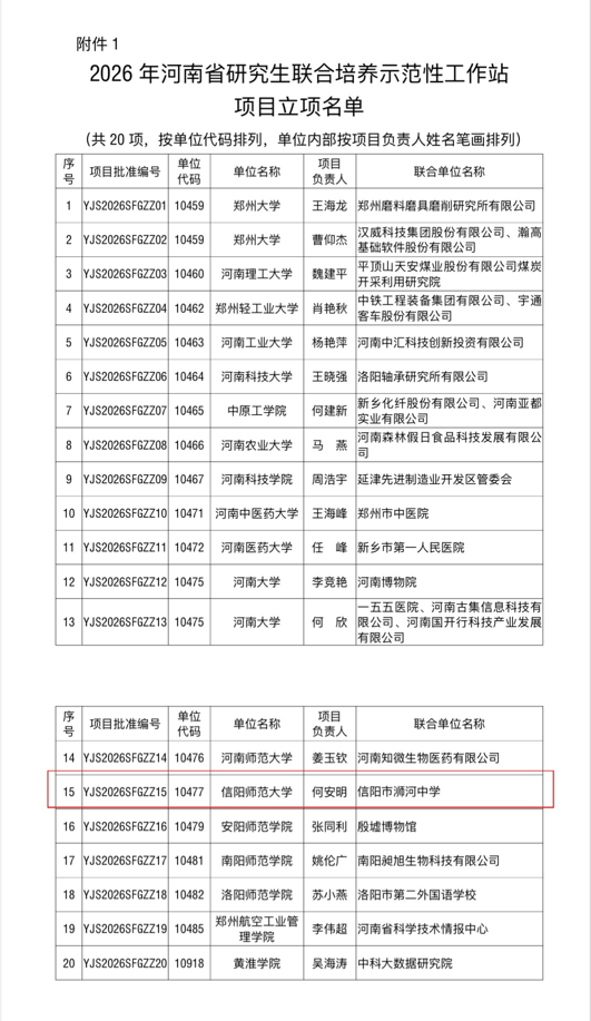 时间:2025-09-30 12:06:27 来源: 作者: 阅读: 次近日,河南省教育厅印发通知,由公司何安明教授牵头申报的“研究生联合培养示范性工作站(伟德国际1946bv—信阳市浉河中学)”成功入选河南省研究生联合培养示范性工作站立项名单,该工作站依托公司2022年获批的河南省研究生联合培养基地申报建设,联合信阳市浉河中学共建。