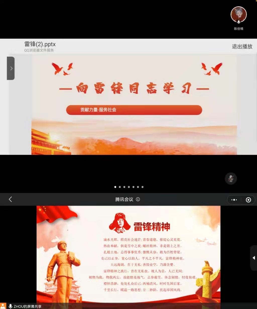 活动中,各社团团支书结合自制的幻灯片和相关视频,形象地向同学们讲述了雷锋同志的感人事迹,阐释了雷锋精神的具体内涵。通过抗疫短片,同学们看到疫情防控中无数医务工作者和志愿者冒着感染的风险,顶着心理压力,承担着超负荷的工作任务,义无反顾地奋战在抗疫一线。这些“最美逆行者” 真实地展现了当代最崇高的“雷锋精神”,也为雷锋精神注入了新的时代内涵,让同学们真切地感受到他们无私奉献、舍己为人的高尚品格。在电影《雷锋》中,同学们与荧屏中的主人公一起感受英雄的一生,大家为雷锋的经历而感动,也被他的“螺丝钉”精神所鼓舞,默默将一颗“雷锋精神”的种子根植于心。会议结束后,大家纷纷在到梦空间晒出自己的团课感悟,不少同学表示今后会继续积极参加志愿服务活动,以雷锋为榜样,回馈社会,服务大众。