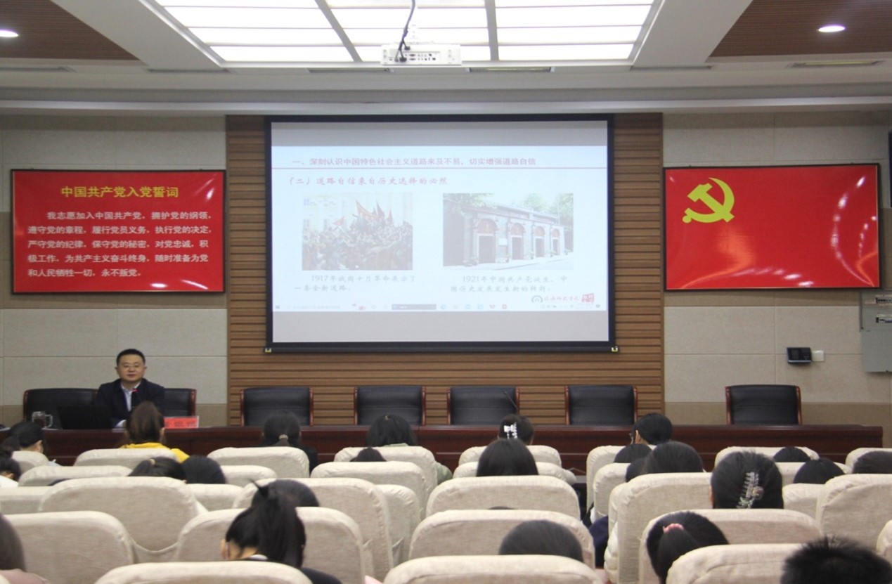 董银银以“增强四个自信,争做时代新人”为主题为全体新生团员上第一次团课,带领全体人员学习了党的重要历史。他指出,新生团员应坚定“四个自信”,立大志、明大德、成大才、担大任,勉励新生团员知行合一,做起而行之的行动者,做永不停歇的奋斗者,以实际行动诠释为祖国、为人民而奋斗的理想信念,要努力使个人志向在实践中得以实现,争做担当民族复兴重任的时代新人。