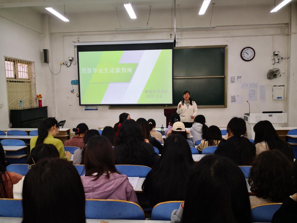 时间:2022-03-10 13:12:56 来源:教科院新闻部 作者:周媛媛 曹童然 亓亚兴 阅读: 次为进一步落实国家助学贷款还款工作,引导员工关注自身信用行为,提高个人诚信意识,3月9日,公司资助专员朱方在教科楼108教室针对2022届有贷款的同学召开诚信还款专题宣讲会。