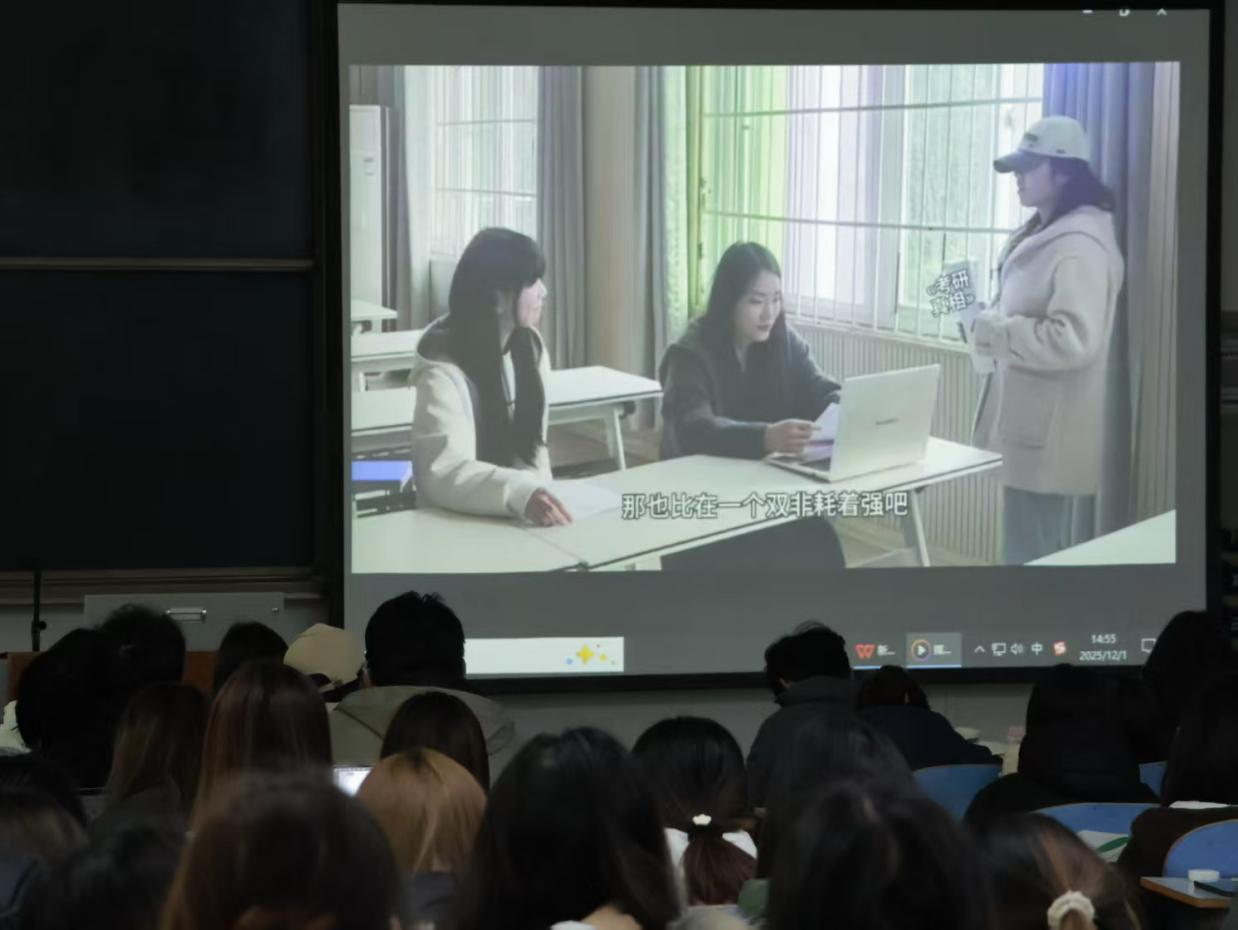 心理学二班分为七组以Vlog形式展示,比赛顺序由各小组组长抽签决定,七支队伍围绕青年心理与行为议题依次展示,内容涵盖多个备受关注的热点:“老员工内耗与焦虑”议题中,同学们深入分析指出,内耗源于对未来的不确定感与自我怀疑,而正念调节能有效帮助个体减少心理消耗;以“考研热”为主题的小组使跟风心理得到细致解读,指出这种行为既浪费个人精力,也加剧了人力资源市场的供需错配;“社会竞争下过分内卷引发的社交疲倦”议题中,揭示了高强度竞争对青年人际关系的负面影响。各小组均将专业知识与社会现实紧密结合,生动展现了心理学服务青年成长的实践价值。