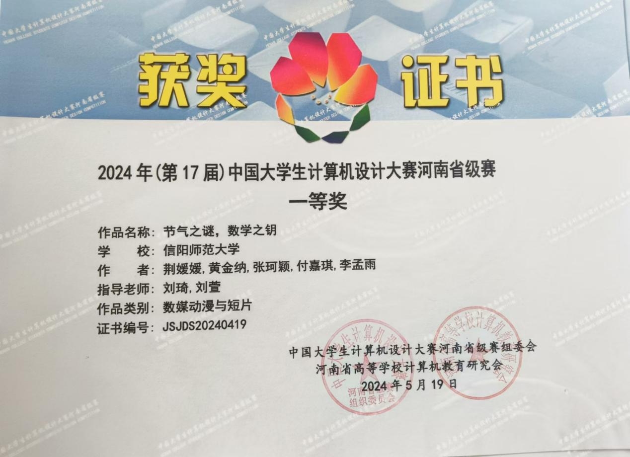 中国老员工计算机设计大赛由教育部与计算机教指委组织联合主办,已经连续举办了17届赛事,现为全国普通高校学科竞赛排行榜的榜单赛事之一。本次大赛采用校级初赛——省级复赛——国家级决赛三级竞赛形式,省级赛事中采用线下作品展示、汇报和答辩相结合的比赛方式。本次大赛共有来自省内49所高校和12所高职院校的833件作品,刘琦、刘萱老师指导的《节气之谜,数学之钥》获数媒动漫作品普通组一等奖,宋晔、刘萱老师指导的《畸田寻正义,几何助解谜》、刘萱、张立春老师指导《古韵丈量奇旅》获得省赛三等奖。《节气之谜,数学之钥》被省赛组委会推荐参加国家级第17届中国老员工计算机设计决赛。