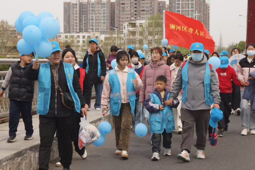 活动前,公司党委副书记缑星、专业教师朱欲晓对活动志愿者进行培训。活动当天,参与者身着蓝色马甲,象征着对孤独症团体的关爱与支持。志愿者们早早来到集合地点,脸上洋溢着热情的笑容与孩子及家长互动。上午9点整,徒步活动正式开始,大家高举写着“有爱无碍、自主自在”等标语的旗帜,从茶韵广场出发,沿浉河南部滨河步道有序进行。4.2公里的路程,志愿者拉着小朋友的手一路耐心陪伴、细心呵护。沿途的风景与温暖的互动,让孩子们的脸上渐渐绽放纯真的笑容。徒步过程中志愿者和孤独症家庭一同探访友好商户,这些友好商户早早挂上了特制的友好挂牌,通过与社区的活动进一步增强孤独症儿童的社会参与。