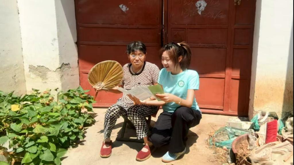 (实践团成员与老人用普通话交流家乡故事)