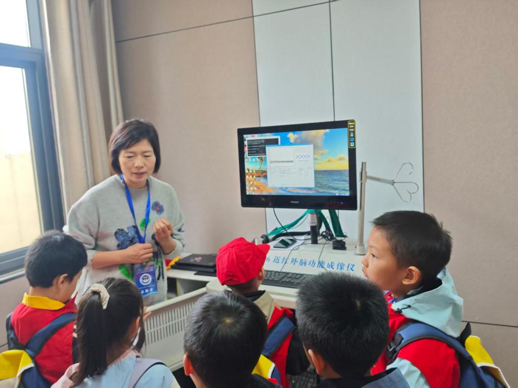 接着,小记者们走进心理科学前沿实验平台,开启了一场科学前沿探索之旅。在志愿者的带领下,孩子们依次参观了眼动实验室、行为实验室、电生理实验室和近红外实验室。刘湍丽老师用通俗易懂的语言讲解实验设备的用途与基本原理,并通过趣味演示引导孩子们思考心理学研究如何帮助我们更好地认识自己。随后在师生访谈环节,小记者们积极提问,围绕情绪、行为与心理健康展开讨论,现场气氛热烈,科学的种子在他们心中悄然生根。