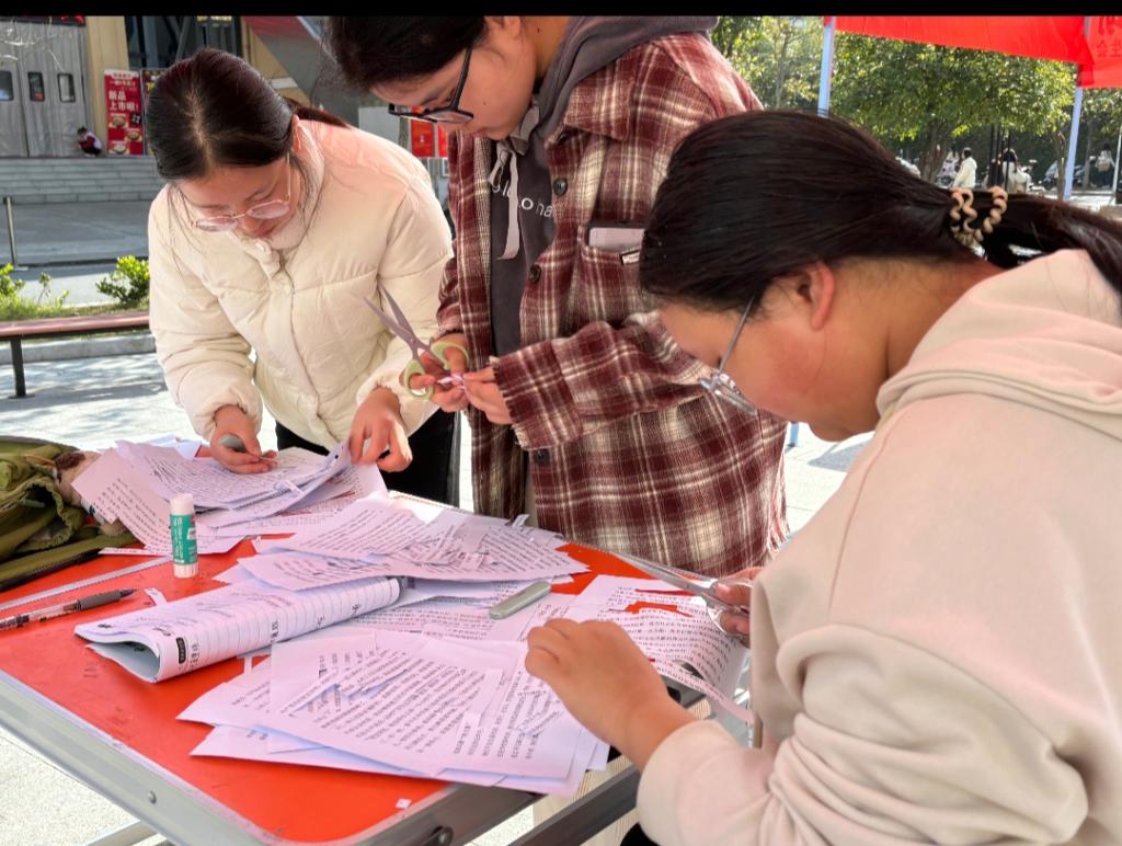 活动筹备阶段,工作人员为参与者准备了剪刀、胶水等工具,并布置了满是“文字碎片”的活动场地。活动期间,组织者介绍拼贴诗的创作方式——从零散词句中挑选组合,拼出独属于自己的“温柔有棱”的故事。同学们俯身于铺满文字的桌面,有人剪下“月亮”“向前走”拼成“月光里,我带着棱角向前走”;有人将“小雏菊”“举着光”贴成带着暖意的短句。创作间隙,大家分享自己的拼贴思路。最后,参与者把自己的拼贴诗贴在一个笔记本上。当风吹过,笔记本的页脚轻轻晃动,那些拼贴的文字在纸页上轻轻呼吸。