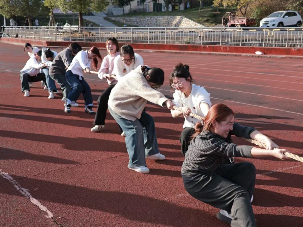 活动筹备阶段,工作人员细化规则、统筹部署,同学们早早集结,满怀期待静待开赛。比赛启幕后,四大趣味项目轮番登场、精彩纷呈。跳大绳现场绳影翻飞,队员们默契起跳,失误时的相互鼓劲与成功时的欢呼相互交织;毽子计数赛上,选手们凝神专注,三人接力配合娴熟,尽显协作巧思;三人两足接力赛中,大家绑紧脚踝、齐喊口号,在相互扶持中稳步前行,尽显团队合力。拔河对抗赛更将氛围推向高潮,队员们紧握绳索、重心下沉奋力拉扯,神情坚毅执着,场边助威声震耳欲聋,每一次绳索牵动都扣人心弦。整场活动掌声、笑声、呐喊声交织回荡,同学们全情投入、尽情畅享运动乐趣,热闹暖心的氛围浸润在场每一人。